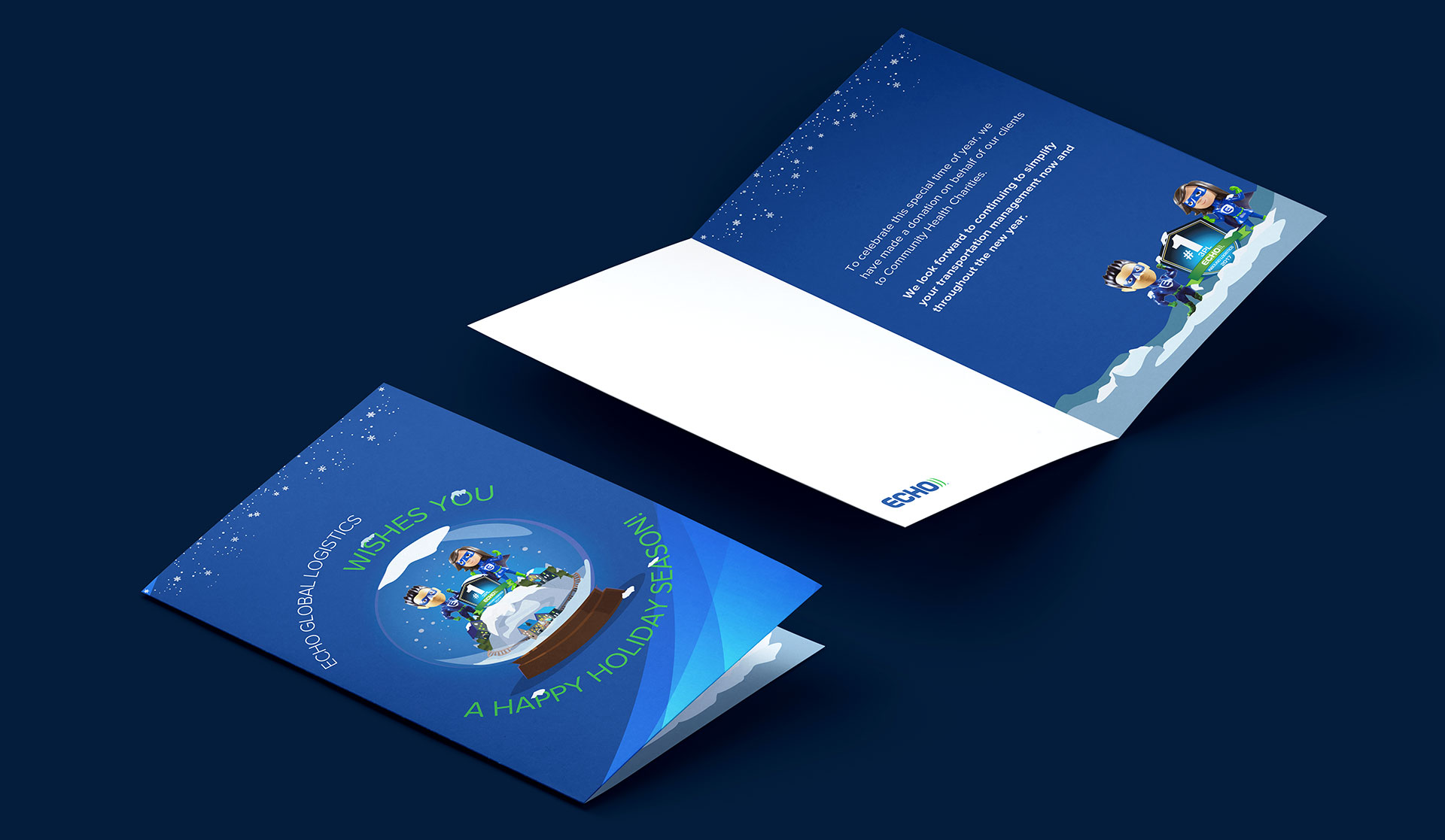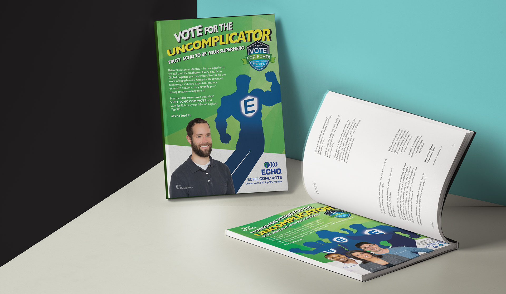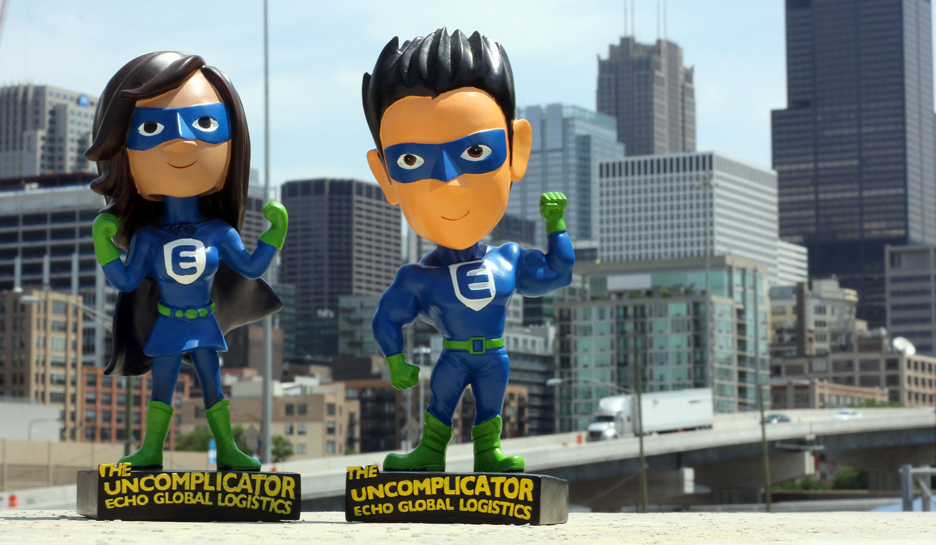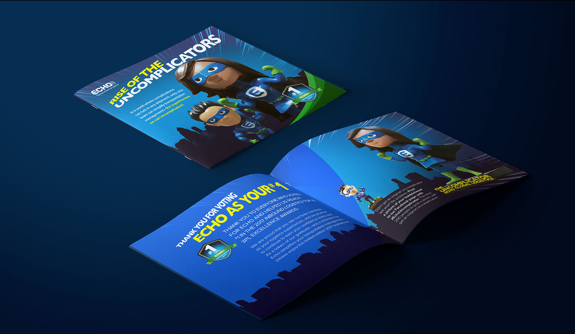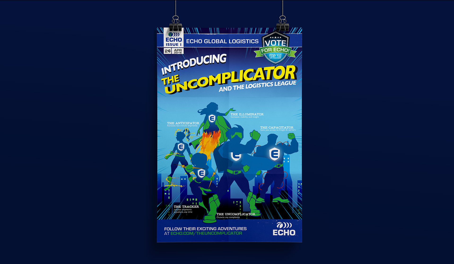 Superpowers. Since it’s their people and their dedication to simplifying transportation management that makes Echo Global Logistics special, we showcase team member’s inner superhero, the Uncomplicator. The creative leveraged comic book tropes, and to excite team members and clients, we created a bobbleheads as a reward for encouraging voting. Echo Global Logistics now won 3 years in a roll with this campaign for Inbound Logistics award.